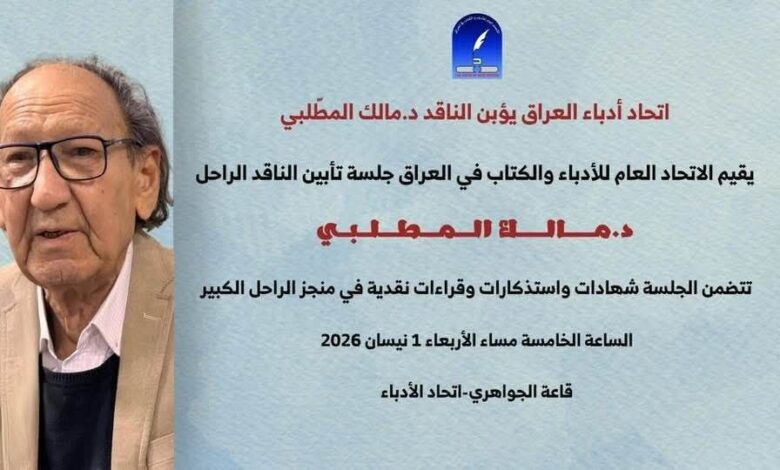 يقيم الاتحاد العام للأدباء والكتاب في العراق، غدا الأربعاء، جلسة عن تجربة الراحل الكبير الدكتور مالك المطلبي اللغوية والأدبية والأكاديمية الممتدة إلى أكثر من نصف قرن.