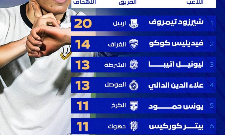 واصل لاعب نادي أربيل شيرزود تيمروف صدارته لقائمة الهدافين في دوري نجوم العراق بعد ختام الجولة السادسة والعشرين، مبتعدا عن أقرب منافسيه لاعب الغراف فيديليس كوكو بفارق ستة أهداف.