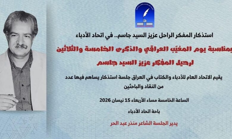 وقال الناطق باسم الاتحاد :إن”الاتحاد العام للأدباء والكتاب في العراق سيقيم جلسة استذكار بمناسبة يوم المُغيّب العراقي والذكرى الخامسة والثلاثين لرحيل المفكر عزيز السيد جاسم يساهم فيها عدد من النقاد والباحثين”.