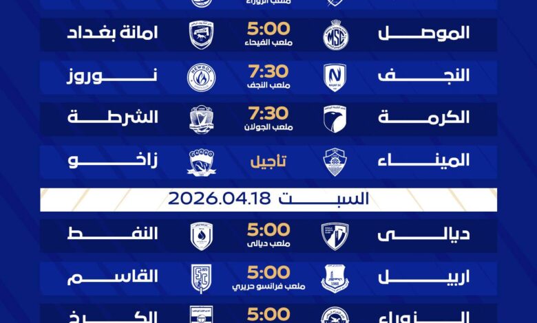 ويفتتح ناديا الكهرباء ونفط ميسان مباريات هذه الجولة في المباراة التي سيحتضنها ملعب الزوراء في بغداد بينما يتواجه ناديا الموصل وأمانة بغداد على ملعب الفيحاء فيما يحل فريق نوروز ضيفاً على النجف في ملعبه وتشهد هذه الجولة أيضا رحلة محفوفة بالمخاطر بالنسبة للشرطة الى ملعب الجولان لمواجهة فريق الكرمة بينما تأجلت مواجهة الميناء وزاخو”.