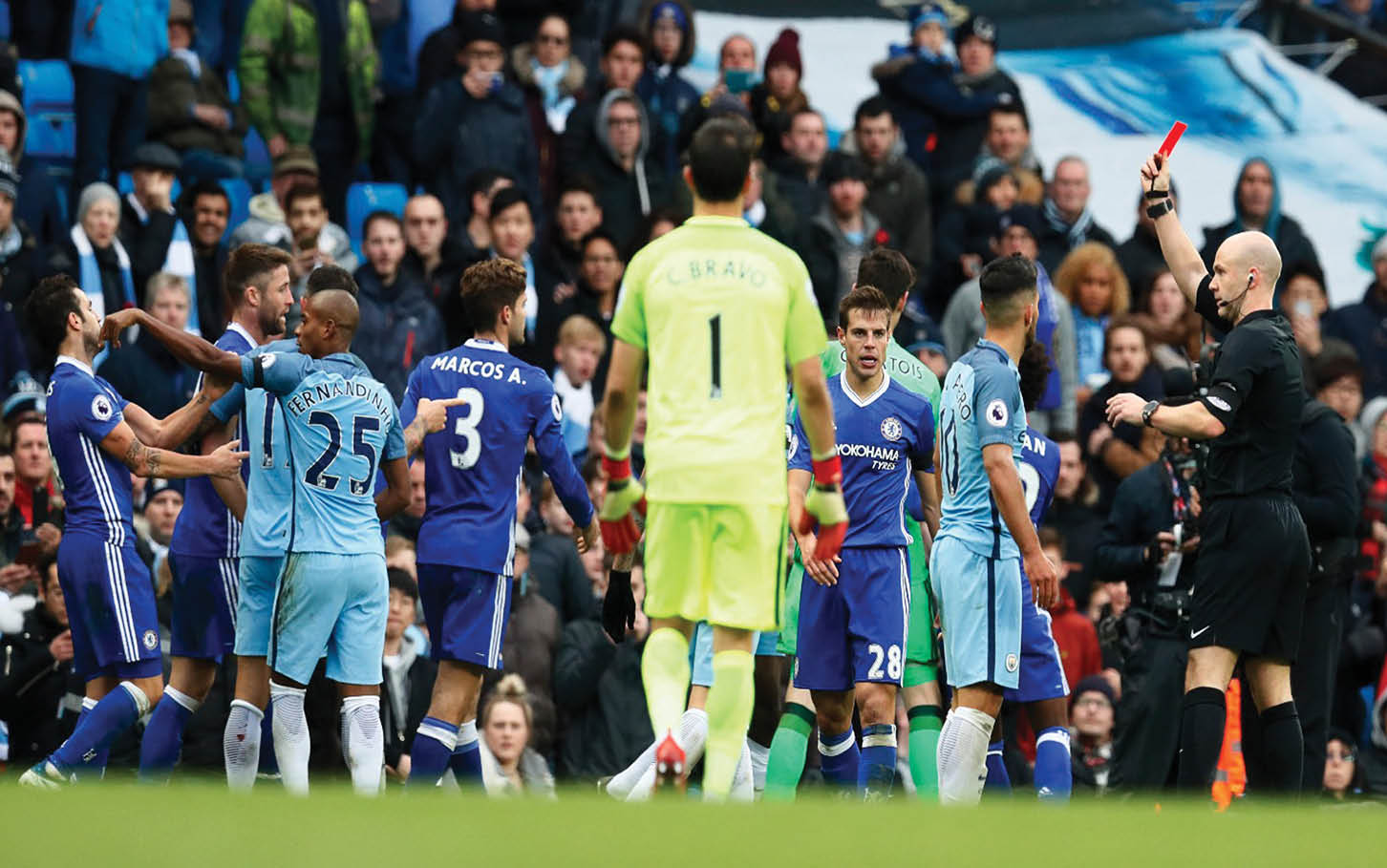 وشهدت المباراة طرد البرازيلي فيرناندينيو نجم مانشستر سيتي في الدقيقة 32 من المباراة، ليكون الطرد الثالث الذي يتعرض له اللاعب في آخر ست مباريات خاضها مع الفريق في مختلف المسابقات هذا الموسم،، مما سيعرضه للإيقاف أربع مباريات.