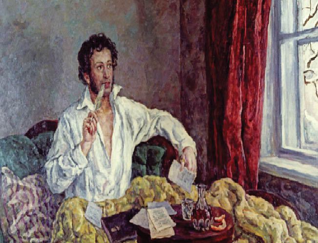 كان بوشكين ـ مثل كل النبلاء الروس آنذاك ـ يعرف اللغة الفرنسية بشكل جيد جدا منذ طفولته, بل ان بعض الباحثين يشيرون الى ان بوشكين كتب اول قصيدة له بالفرنسية, وعدا اللغة الفرنسية كان يعرف عدة لغات اخرى. هناك ايضا لغات اجنبية عديدة حاول بوشكين اثناء مسيرة حياته ان يتعرّف عليها و يدرسها ـ بشكل او بآخر ـ لاغراض ابداعية, بما فيها العربية, وقد تم طبع الاوراق والمسودات التي كانت موجودة لدى بوشكين. ويرى القارئ فيها كل محاولات بوشكين للتعرف على تلك اللغات, وتوجد هناك بعض الحروف العربية ولفظها بالروسية بخط يده.