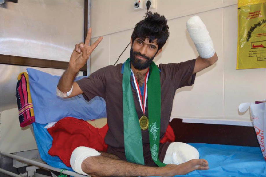 محمد رمضان .. شاب في مقتبل العمر لم ينهِ دراسته الجامعية بعد, كونه أحد طلاب المرحلة الثالثة في الكلية التقنية جامعة بغداد, لبّى نداء الوطن في الدفاع عن الأرض والعرض, لينال نصيبه من تلك التضحية بوسام شرف كما يصفه بشجاعة وثبات, بعدما قطعت ساقه ويده اليمنى في احدى المعارك, لكنه لم يتراجع عن موقفه ولم تثبط عزيمته, اذ ضجت مواقع التواصل الاجتماعي بفيديو للشاب “محمد رمضان” وهو يردد اهزوجة, يخاطب بها امرأة كبيرة في السن “الجف والساك انطيهن ..حتى تنامن مستورات”, فلم تفارق الابتسامة المرسومة على وجه البطل محمد في صوره التي تناقلها الناشطون على “فيس بوك”, حيث جسّد بهذا الموقف أروع صور الشجاعة والبطولة.