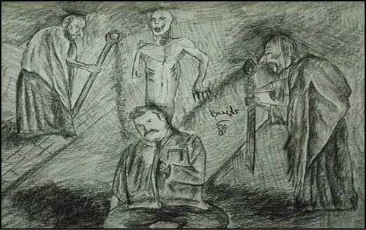يقول الرسام: ولما اخذ إبن وسام الغضب، جاء بالعجب. فاتى بسحرٍ احمر، وانقلب الى دجالٍ اعور. واقسم ان يسترجع ماله، فذهب الى السوق حيث يعمل ابن علاء وصاح: ايها الناس، إن فيكم مسحور، يخاف من النور، يغتاظ من الاذان، ويصيح عند سماع القرآن، قصيرٌ سمين، يركبه جنٌ لعين، جنيٌ من الهند، اخر من الصين، اسود العينين، متورد الخدين، يلاحق رجال الدين، وينصب لكل واحد منهم كمين.فعرف الناس إنه يقصد ابن علاء، فتقدم نحوه، فاوقفه ابن علاء وقال: ولِمَ استعين بك وعندي من يعينني؟ ثم قال: -سيخرجه شيخٌ قدير، لا يعصي عليه العسير. واشار اليّ بقوله، ثم جمع الناس حوله. فابت نفسي رد كلامه، ونسيت وعد ماجد وانتقامه. ثم قال ابن علاء: ايها الناس سوف آتيكم بكل سحار عليم، ليُذهِب عني الداء السقيم. وما ان جمعنا حتى قال: القوا ما انتم ملقون.