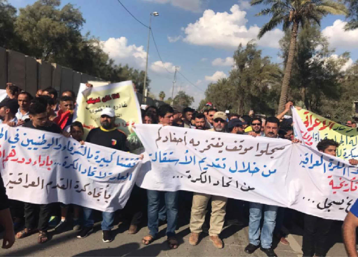 وقال الاعلامي حيدر زكي وهو احد المنظمين للتظاهرة «الى كل من يسعى لعودة الهيبة والى كل من يحلم برؤية الشخص المناسب في مكانه المناسب، سيكون يوم الثلاثاء الساعة الثانية والنصف موعدا للتظاهرة الجماهيرية الكبرى الرافضة لسياسة اتحاد الكرة في التعامل مع المنتخبات الوطنية والنجوم الكروية».
