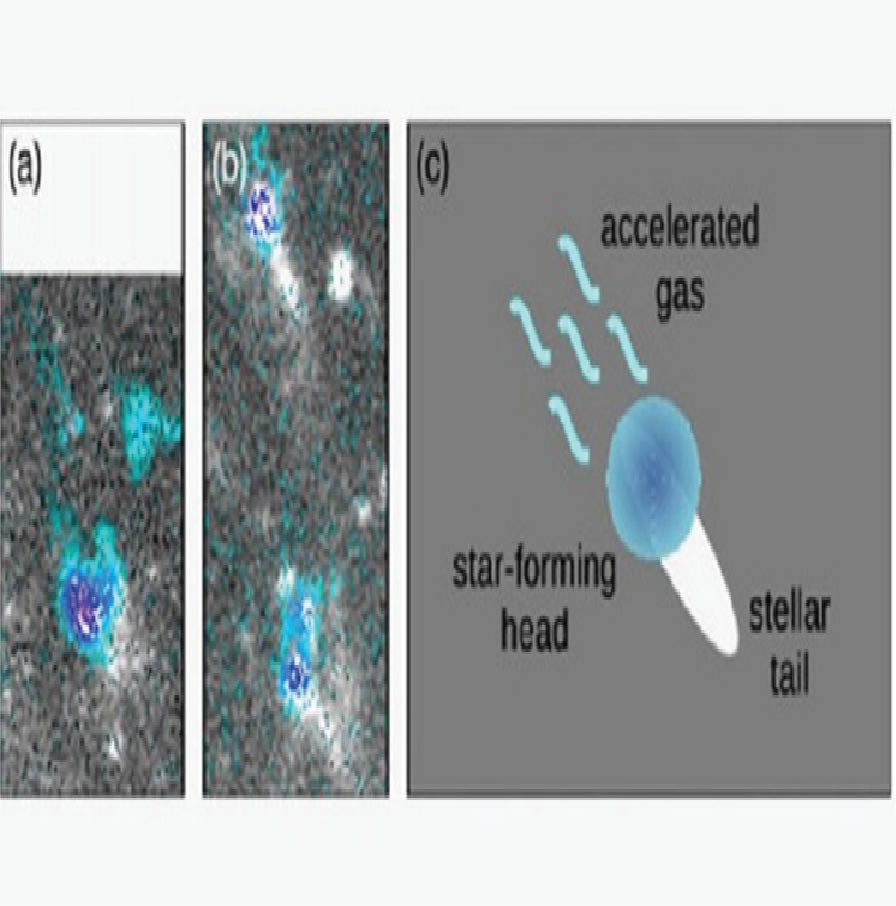 ويعتقد العلماء أن المجرة اكتسبت هذا الشكل بعد مرورها بالوسط الكثيف لتكتل المجرات، حيث انضغط جزء من مادتها مشكلا ذيلا من النجوم. أما «القطرات» فظهرت حسب العلماء نتيجة الاندماج مع مجرة أخرى. وقد تم اكتشاف المجرة غريبة الشكل بواسطة مطياف Multi Unit Spectroscopic Explore الذي زُوّد به مرصد في جبال تشيلي. يذكر أن تكتل المجرات هو تشكيلة ضخمة تتألف من بضع مجرات مرتبطة ببعضها بواسطة الجاذبية، وقد تبلغ أبعاد تلك التكتلات عشرات ملايين السنين الضوئية.