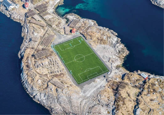 هينينغسفر إدرتسلاغ، هي قرية صيد صغيرة تقع على جزيرتين قبالة لوفوتن، النرويج، وهي التي تحتوي على واحد من أجمل ملاعب كرة القدم في العالم، وبالتأكيد لا يُمكننا أن نُطلق عليه اسم “إستاد”، لأنه لا يشتمل على أي مُدرجات، فقط بعض الصخور الصلبة التي تُحيط به. هذا الملعب الذي يستخدمه فقط هواة كرة القدم، لديه موقع مُهيب، إذ إنه يوجد في جزيرة صخريّة تُحيط بها المناظر الخلابة من جميع الجهات، بما في ذلك الجبال العالية، والقمم الجليدية، والبحر المفتوح والخلجات المحمية. تم بناء الملعب بعد تسوية حجر الأساس الصلب في الجزء الجنوبي من جزيرة هلاندسويا، كما ويُحيط بالملعب عدد هائل من رفوف تجفيف سمك القد. حول الملعب يُوجد مسار اسفلتي يُستخدم سواء لتواجد الجماهير أو حتى موقف للسيارات، ويبدو بأنه سعة الملعب صغيرة، نظرا لأن قرية هنينغسفر لا يسكنها سوى نحو 500 شخص فقط.