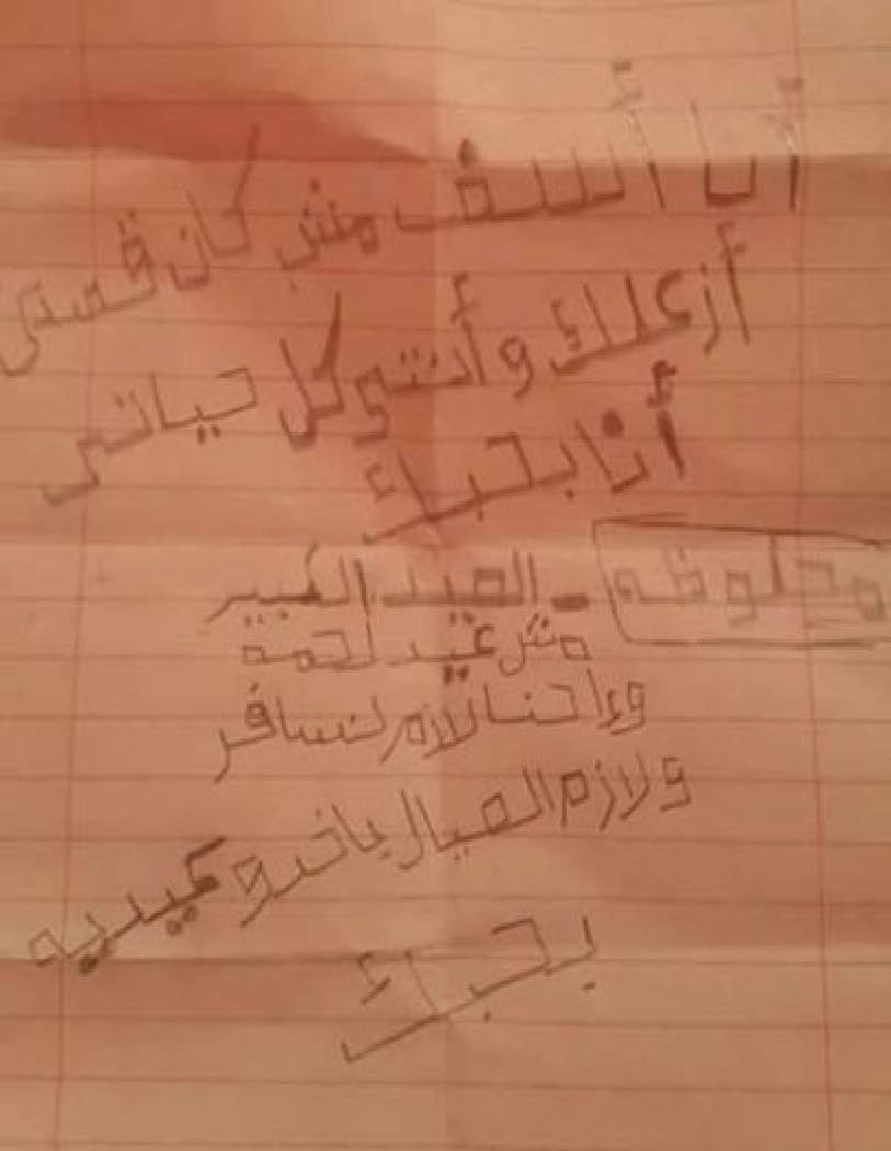 أصبح طفل، حديث موقع التواصل الاجتماعي (فيسبوك) بعد محاولته مصالحة والديه المتخاصمين بتزوير خطاب بإسميهما. كتب الطفل خطابا من نسختين مضمونه: (أنا آسف مش كان قصدي أزعلك وإنتي كل حياتي، أنا بحبك، بالعيد الكبير لازم نسافر ولازم العيال ياخدوا عيدية (بحبك))، وأرسل الطفل الخطابين لوالديه على أنهما رسالتان متبادلتان بينهما، ظناً منه أن ذلك سيجعلهما يتصالحان. حاز الخطاب على إعجاب الكثيرين الذين أثنوا على شعور الطفل.